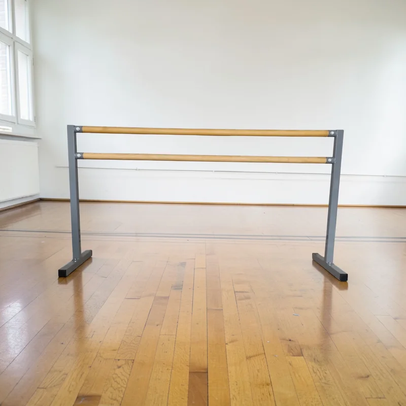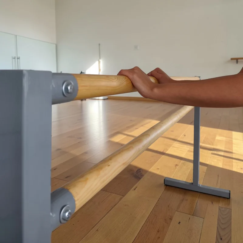 Barra de ballet doble de 200 cm de largo, con altura estándar de 110 cm o fabricación a medida según tus necesidades.